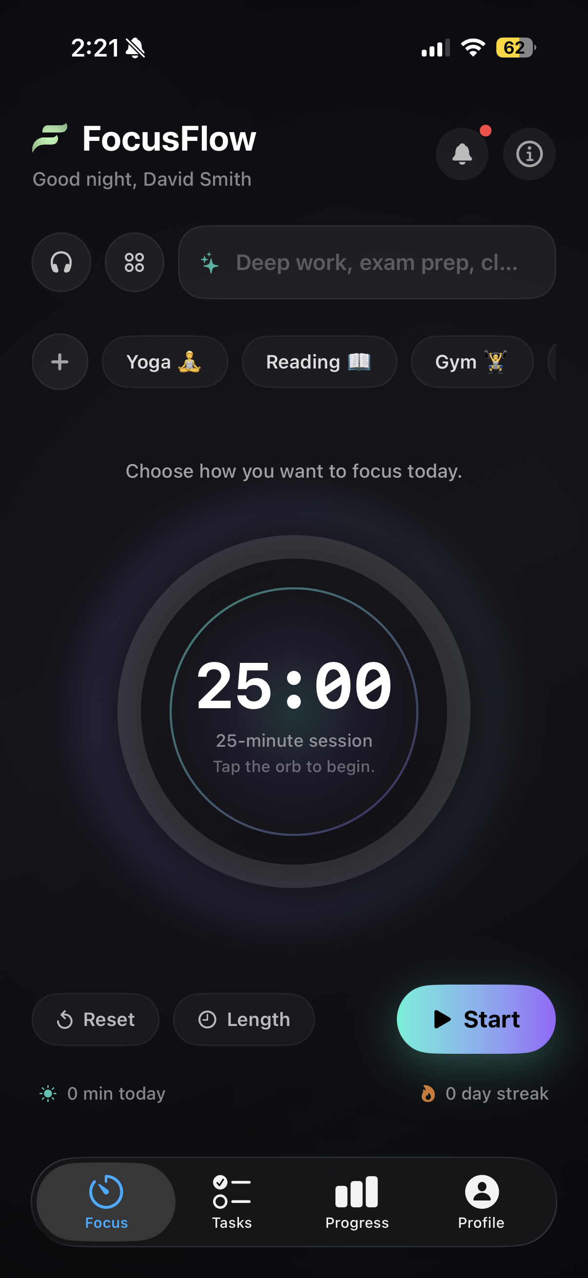 Start timed sessions with customizable durations. Choose from 14 ambient backgrounds, 11 focus sounds, or connect your music app. Set session intentions to stay focused on what matters.