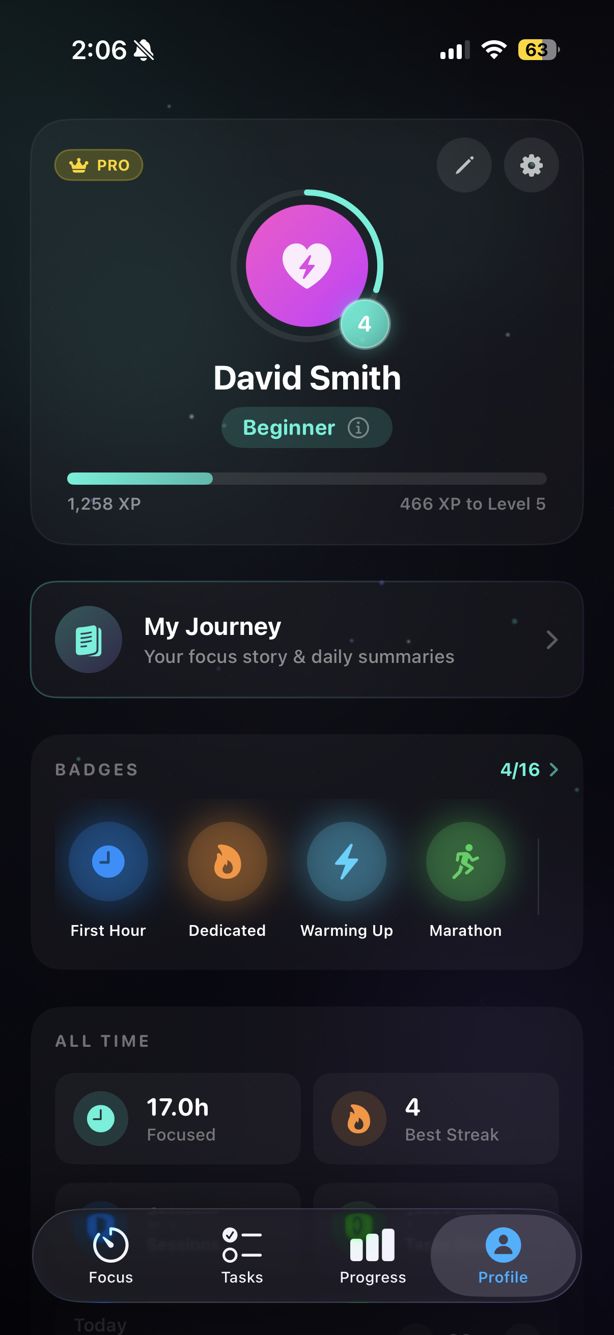 Earn XP for every completed focus session and task. Progress through 50 levels from Beginner to Transcendent (Pro)