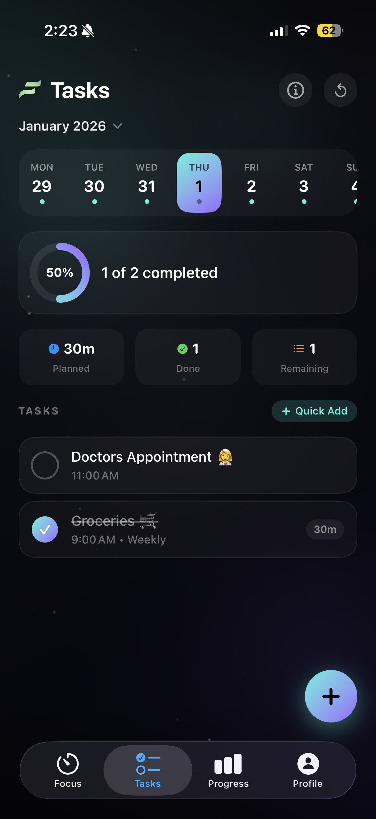 Organize your to-dos with recurring schedules, reminders, and focus session integration. Track duration estimates and see your progress at a glance.